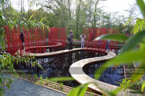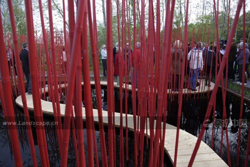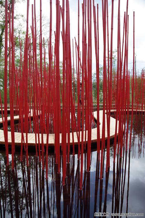 曲線形的木棧道對(duì)角穿越方形水池,漂浮于水面。小棧道僅50厘米寬,容一人穿行。它是“圓”的符號(hào),也是體驗(yàn)水池?zé)o限風(fēng)光的路徑。水池中間是三叢紅色竹竿,它們可取之四周竹林的老桿,是可再生的材料。垂直的竹竿叢沿木棧道分布,令行走在棧道上的游客體驗(yàn)穿越的快感。垂直的竹叢倒影水中,與變換的天景相輝映,創(chuàng)造出寧靜和深遠(yuǎn)的氛圍。雖然水深只有30厘米,卻通過垂直向天的紅色竹竿,創(chuàng)造出無限深遠(yuǎn)的感覺。方圓周邊和水中植物全部為中國植物,渲染出濃郁的中國氣氛。