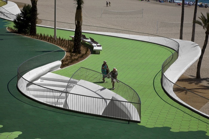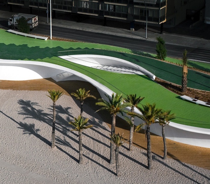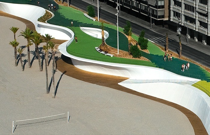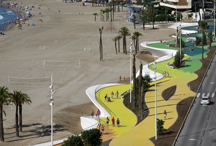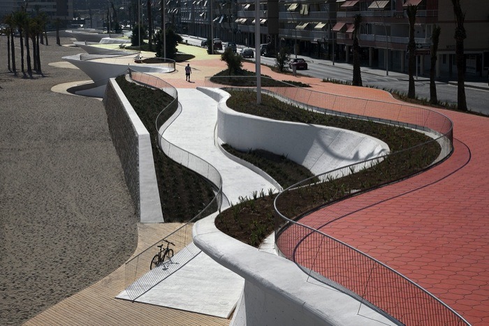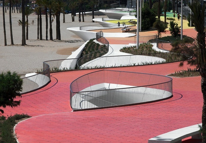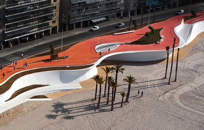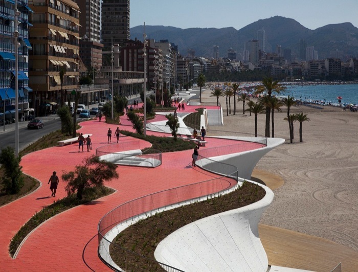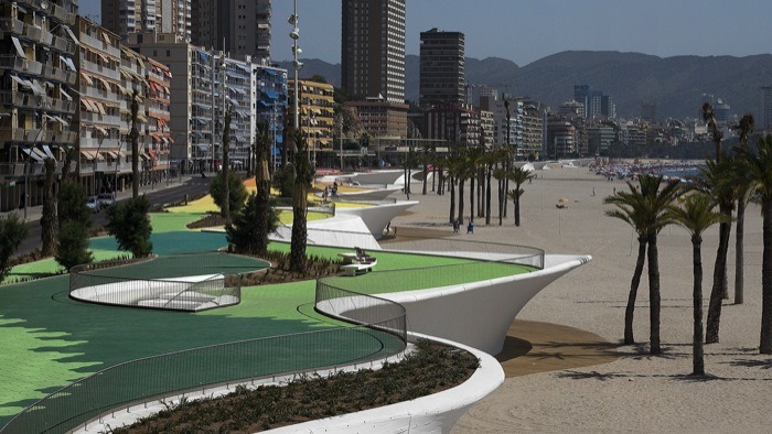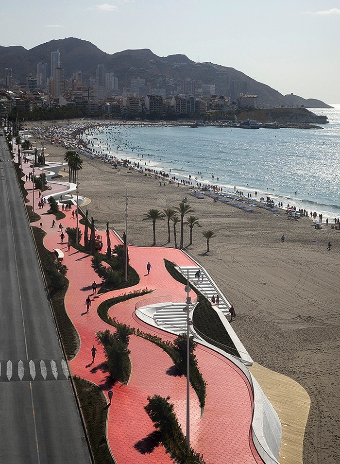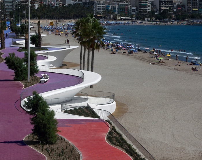 由巴塞羅那OAB建筑事務(wù)所設(shè)計,這個城市海濱景觀設(shè)計沿著貝尼多姆海灘,位于西班牙。該地點是一個受歡迎的景點,有高層建筑,長廊,且設(shè)有酒吧和水景。然而,OAB建筑事務(wù)所除了給繁華的海濱地帶創(chuàng)建了一致的元素外,同時也把一些相似的地區(qū)相互分離開來。